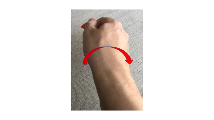 The other part is “tilt”. We tilt the pick in a certain direction depending on whether we are down strumming or up strumming. When we down strum, we turn our wrist slightly counter clockwise as we move our arm. This creates a “tilt” of the pick relative to the body of the guitar. When up strumming, we twist the wrist in a slightly clockwise direction. Kind of how a conductor’s wrist motion would look like: